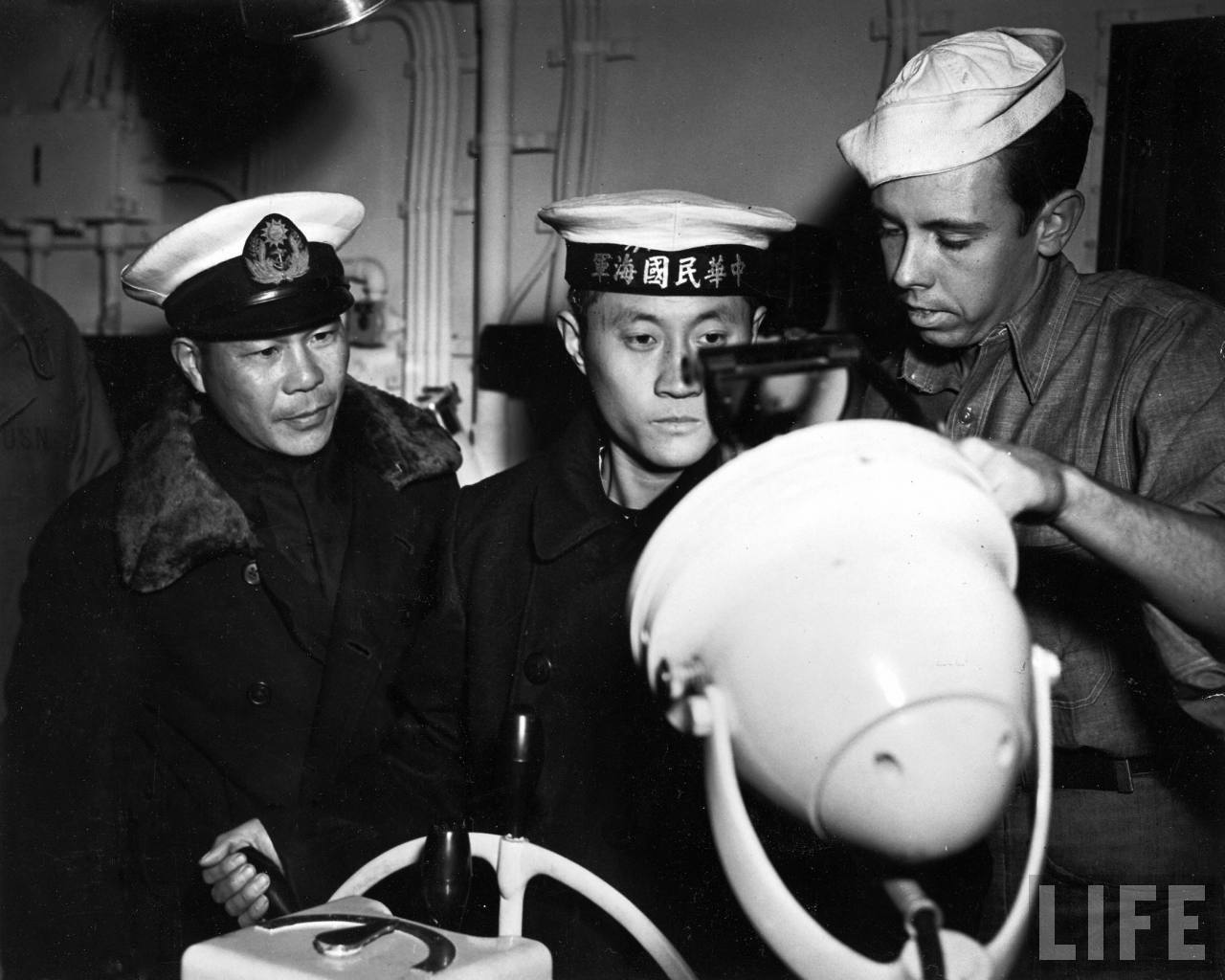 1946年1月9日,中国青岛。美军水兵Joseph Isham正在登陆艇上教中华民国海军水兵。.jpg