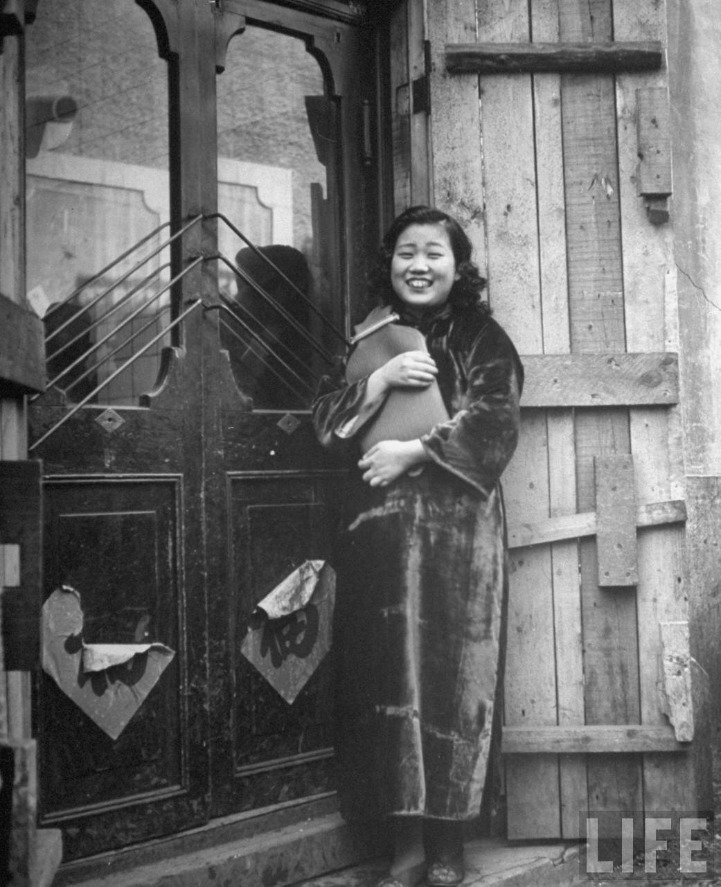1946年3月,中国沈阳。一个高级妓女站在她的公寓门口,手里拿着热水袋以抵御满洲的寒冷。.jpg