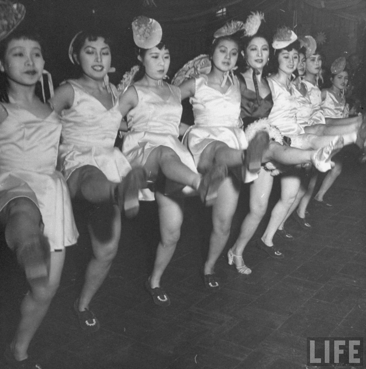 1946年3月,中国沈阳。中国和日本女孩在晚会上唱歌跳舞,他们在木地板上表演。这时,原满洲国地区被苏联红军控制,并在大连建有空军基地。.jpg