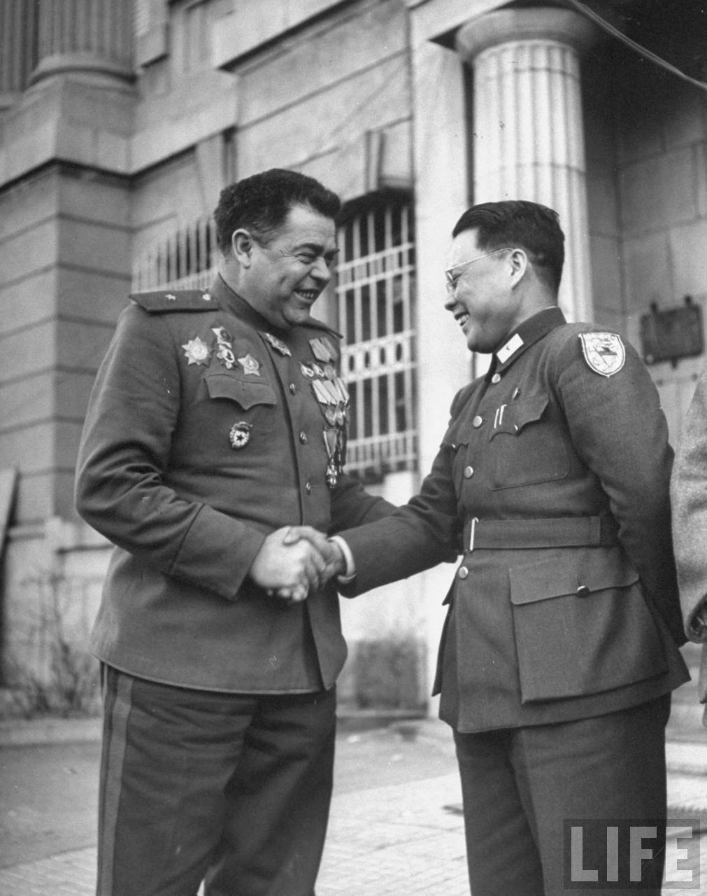 1946年3月,中国沈阳。根据联合国决议,原日本窃取中国之满洲、台湾、澎湖、南海诸岛等领土均归还中国。这是负责接收的中华民国代表Shung P. Peng (右,谁?) 与原沈阳临时负责人苏联将军Kovtun-Stenkovitch握手。.jpg