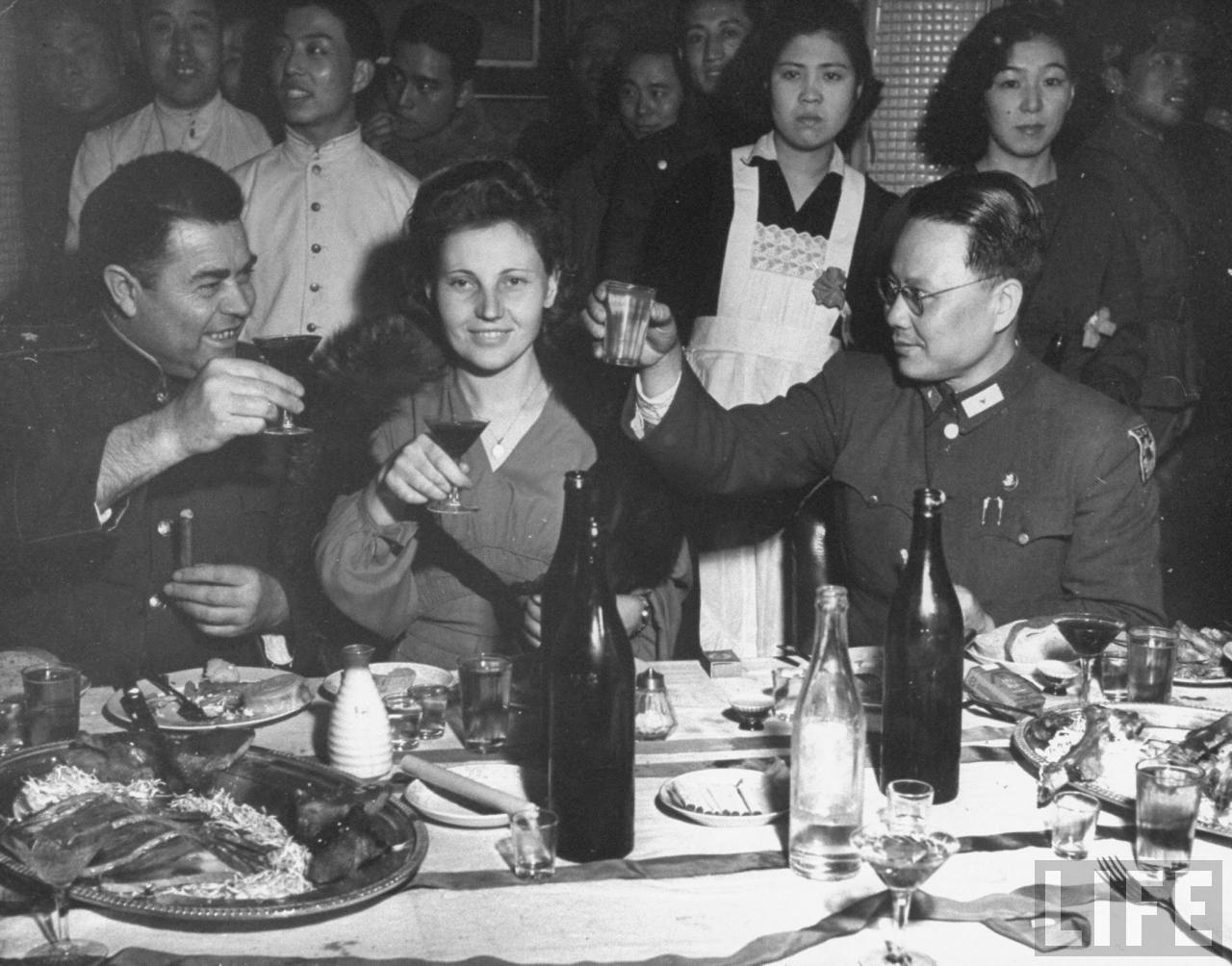 1946年3月,中国沈阳。苏联将军Kovtun-Stenkavitch用中文“干杯”向中华民国代表Shung P. Peng致敬,中间那位是他的夫人。.jpg