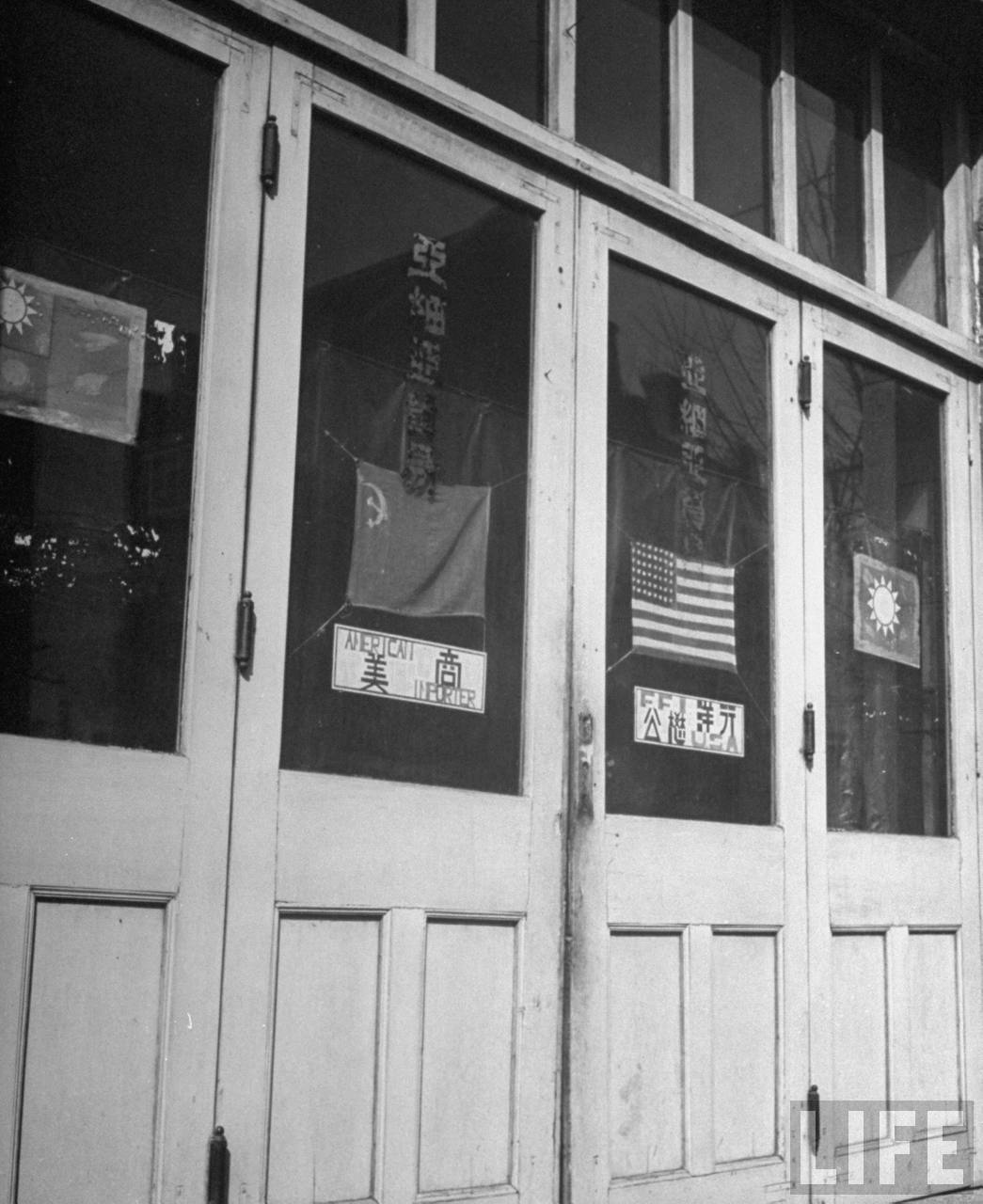 1946年3月,中国沈阳。这家“亚细亚贸易”商号的门上贴着中华民国、苏联及美国国旗。.jpg