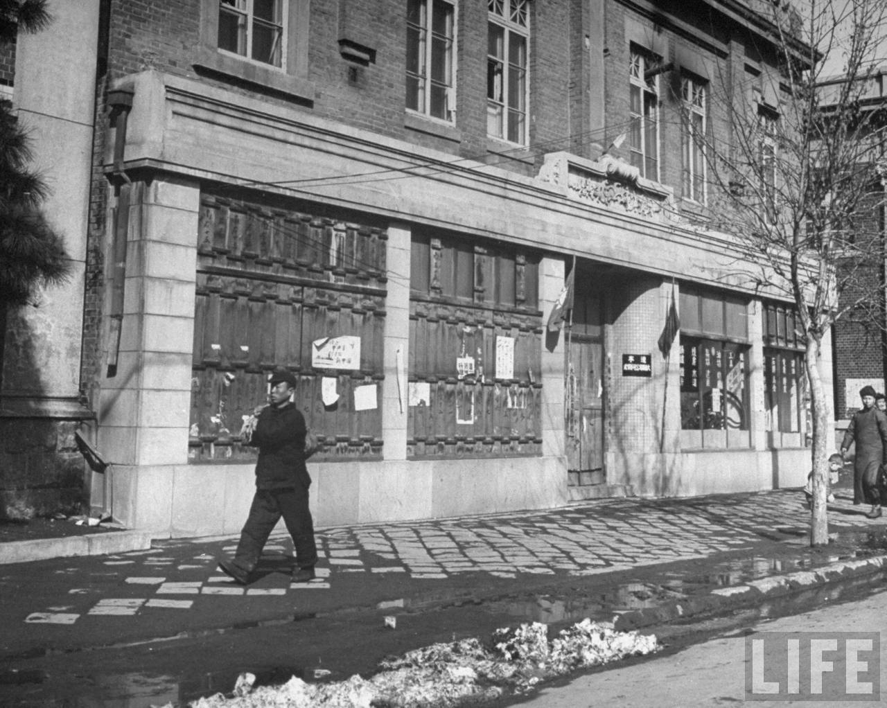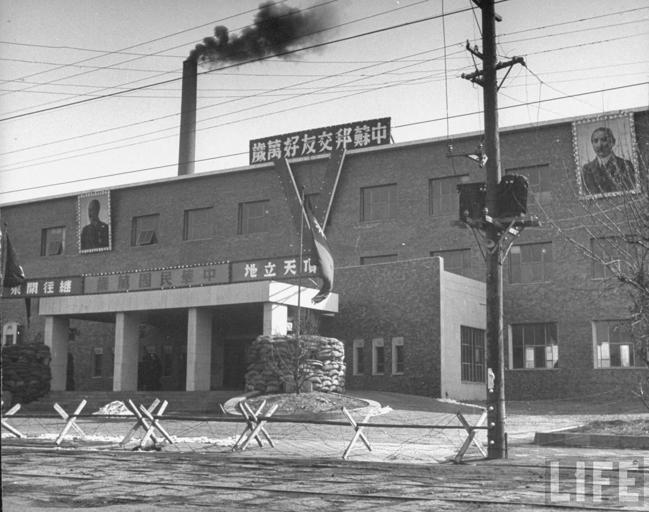 1946年3月,中国沈阳。这里是负责光复满洲的中华民国国军总部驻地,前面有路障和沙包,门框上写着“中华民国万岁”,墙上有蒋介石画像,房顶上写着“中苏邦交友好万岁”,它原来是一家日资银行总部。.jpg