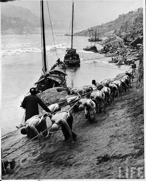 1946年3月,中国西部。2排的中国纤夫,利用屈身这个姿势在长江岸边奋力拖曳帆船(一种中国内河常见的交通工具),他们慢慢地是纤夫头(左)的指示下完成这个工作,获取微薄的收入。.jpg