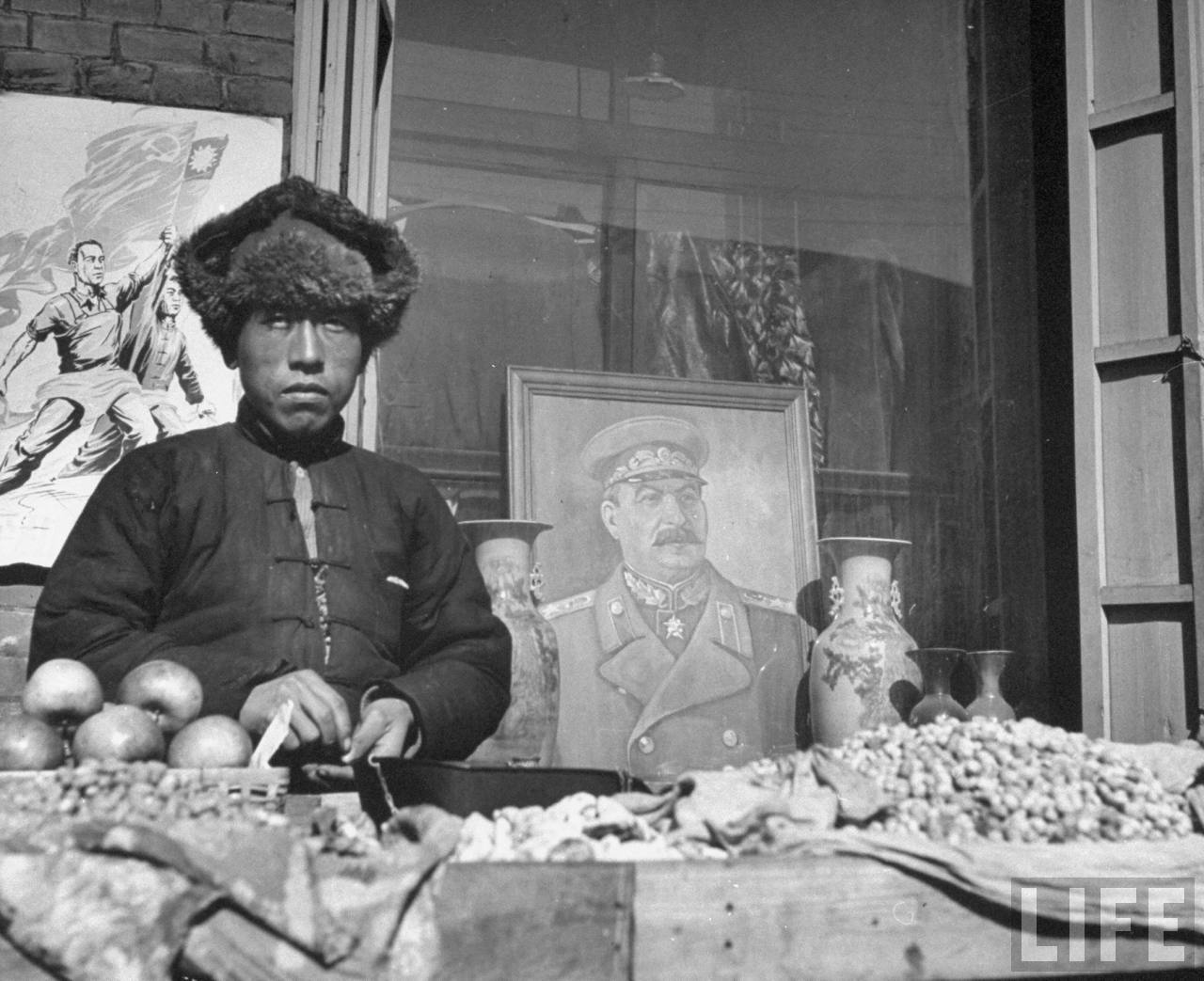 1946年3月,沈阳。一个售卖水果的中国商贩,后面的商店橱窗里是苏联的宣传画和苏联大元帅约瑟夫·斯大林的头像。.jpg