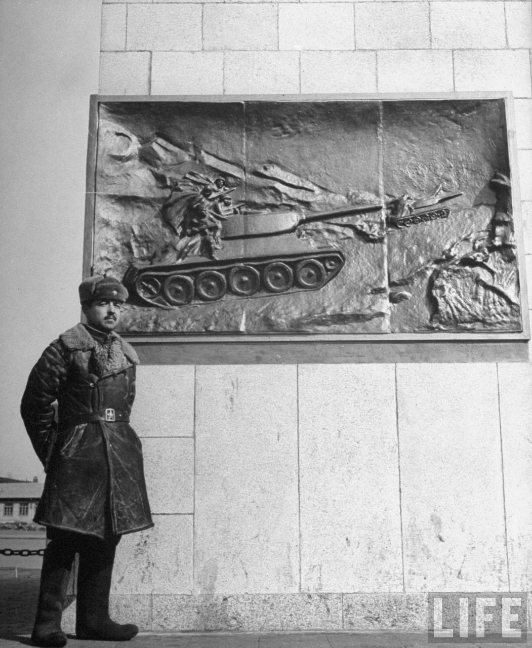 1946年3月,沈阳。一个苏联红军站在街头纪念碑前,这座碑上面有铜制的宣传画,这座奉天省省会城市完全由苏联人控制,在这个省的南部的旅顺和大连,苏联人还建立了军事基地,中华民国还无法顺利接收。.jpg