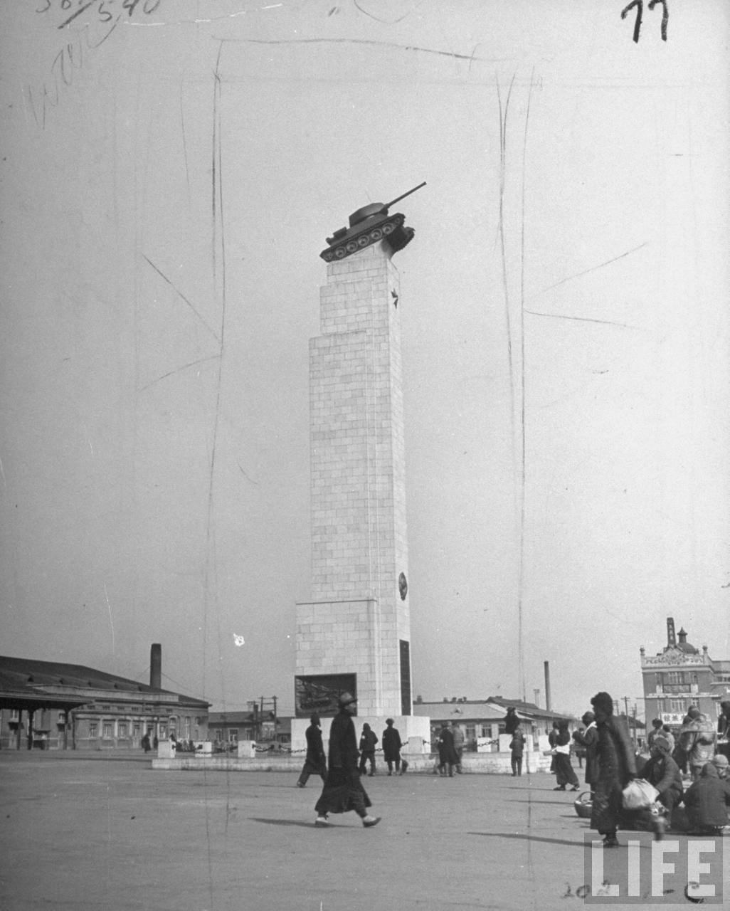 1946年3月,沈阳。在市中心,苏联人树立了一座高耸入云的纪念塔,塔顶上放置的是苏联坦克,以纪念满洲战役和宣示苏联对满洲国地区的占领。.jpg