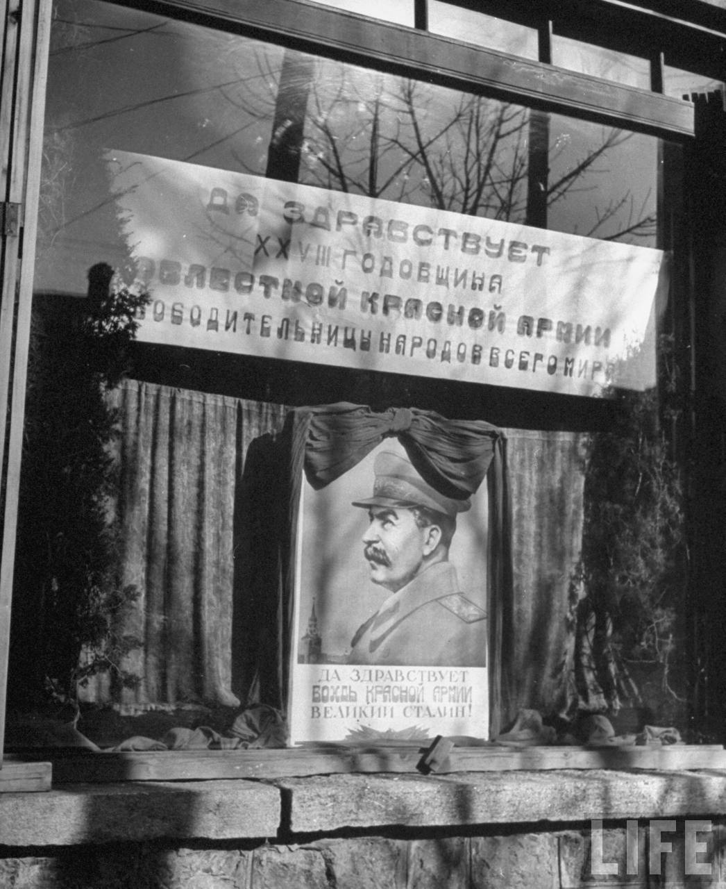 1946年3月,沈阳。在苏联人管辖下获准营业的商铺都必须悬挂苏联领袖约瑟夫·斯大林的画像,他俨然成为满洲国地区的主宰。.jpg