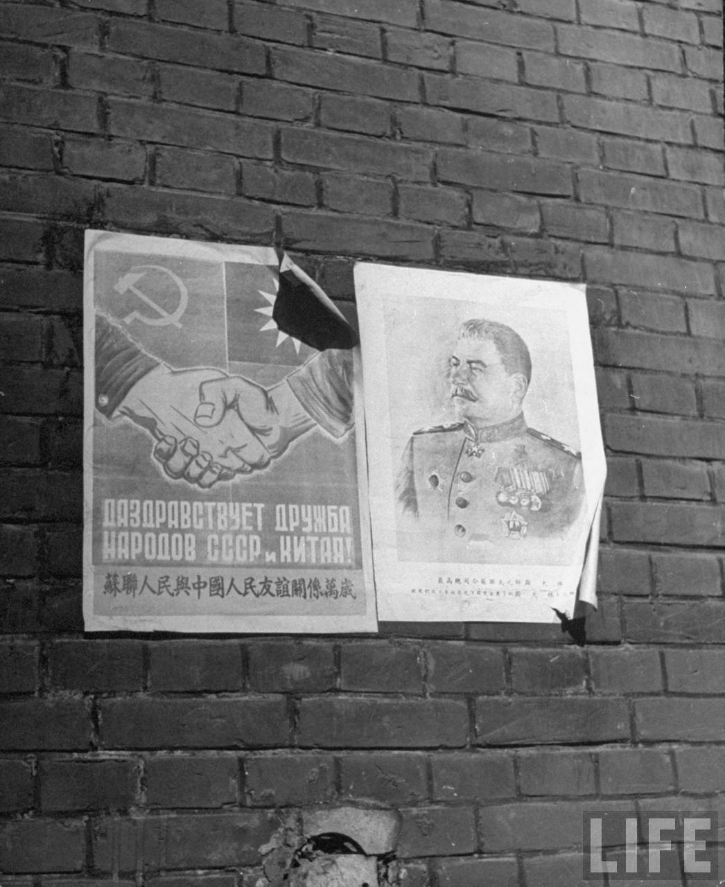 1946年3月,沈阳。街道的墙面上到处贴满了宣扬苏联和斯大林的海报。.jpg
