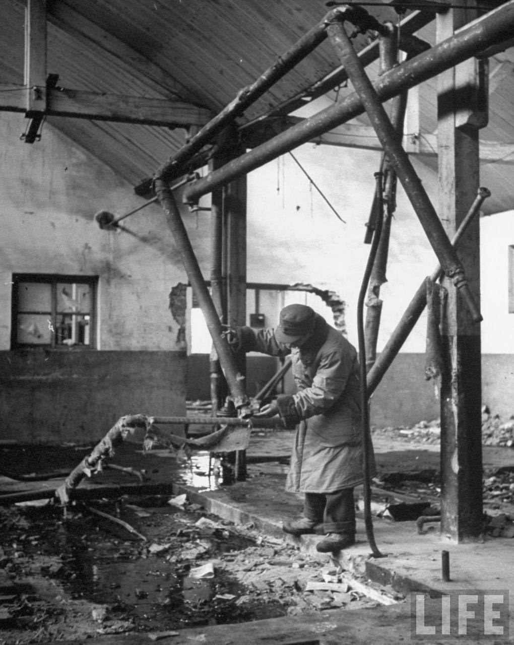 1946年3月,沈阳。原来的一家大型日本人开办的橡胶厂,苏联搬走所有的机器和设备后就把它焚烧掉,但一些搬不走的大型的机器设备清晰可见。.jpg