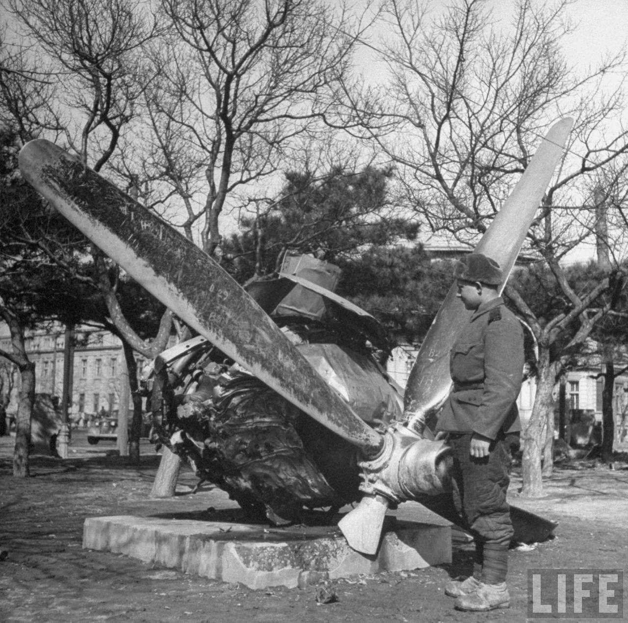 1946年3月,沈阳。这是满洲国时期的一座公园,日本人将被其击落的美军B-29轰炸机的电机放置在这里以宣扬他们的武功,一个苏联士兵正在看着它。.jpg