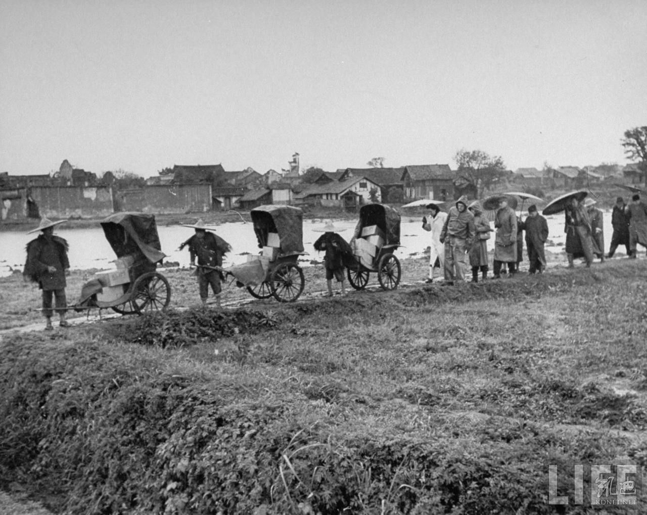 1946年5月,中国。联合国紧急救济的奶粉正用人力三轮车运送发往灾区,救灾人员徒步护送。.jpg