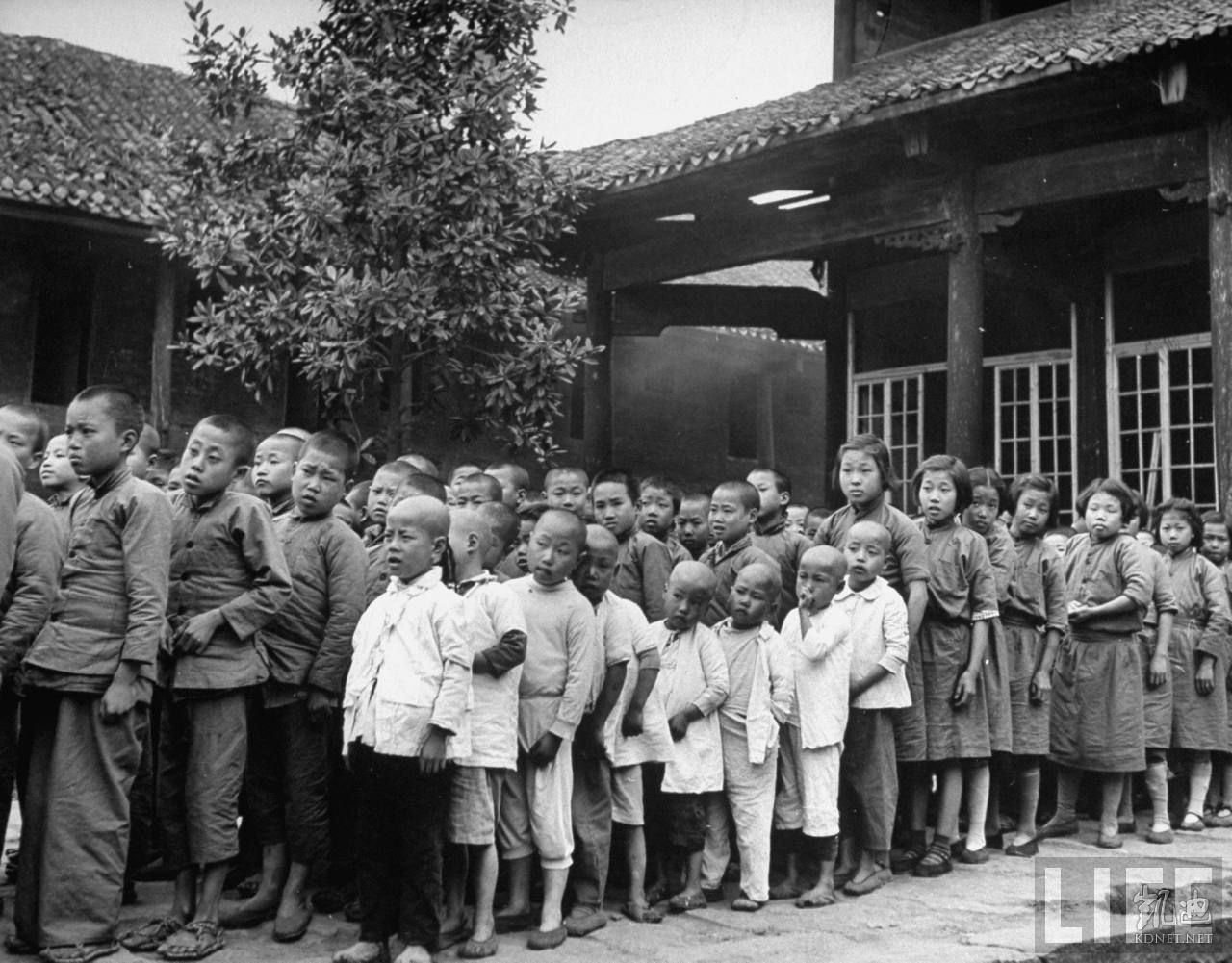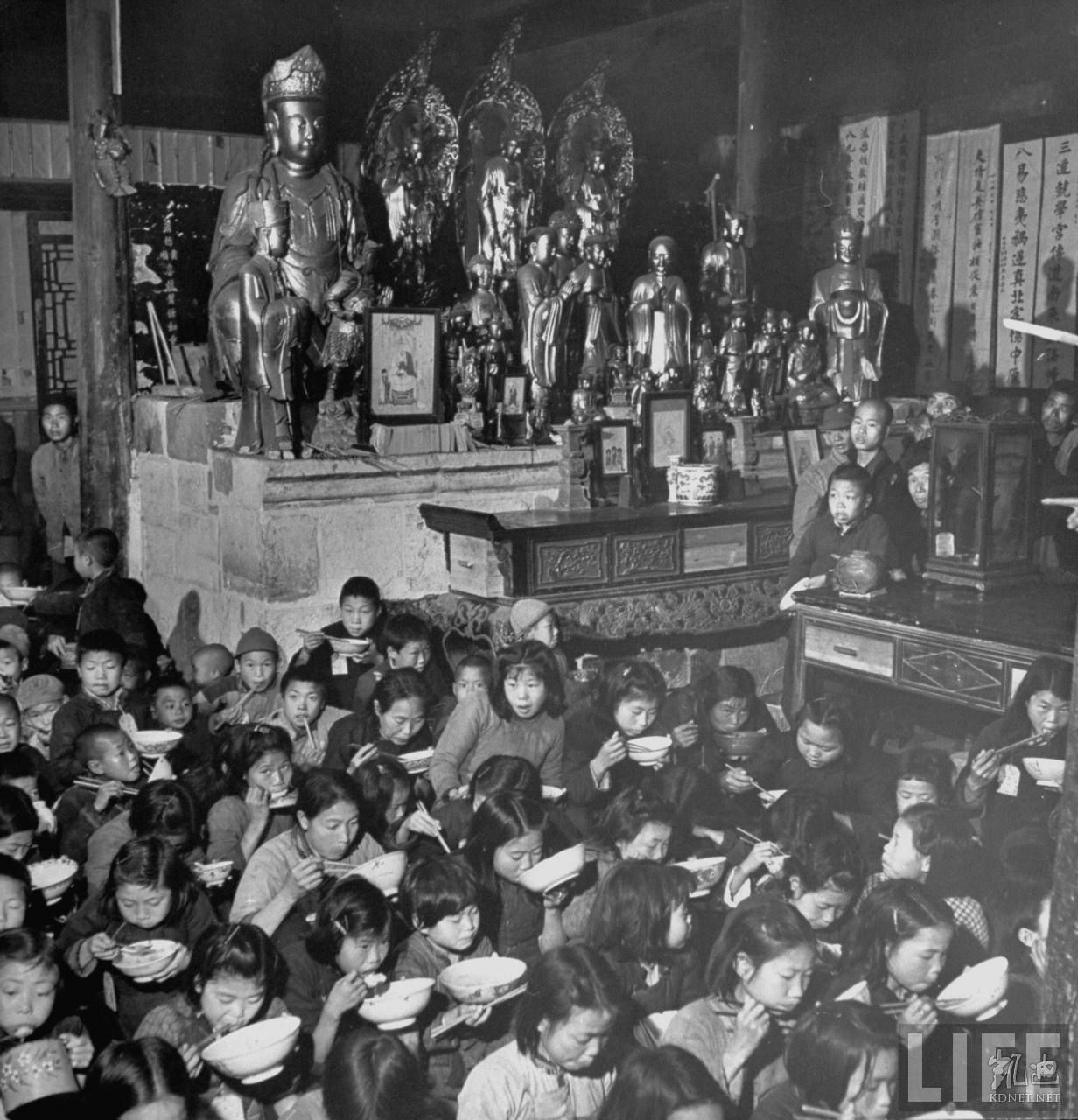 1946年5月,湖南衡阳。衡阳是二战被日军毁灭的城市,战后又发生旱灾,饥民遍地。这是寺庙为饥民儿童提供斋饭的场景。.jpg