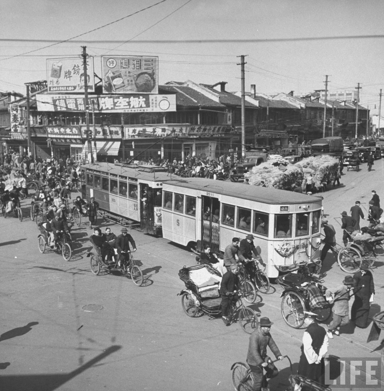 1947年,上海。交通阻塞,严重的超载的汽车,有轨电车,众多的人力车,自行车和人力拖车。.jpg
