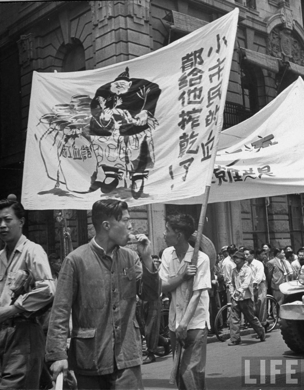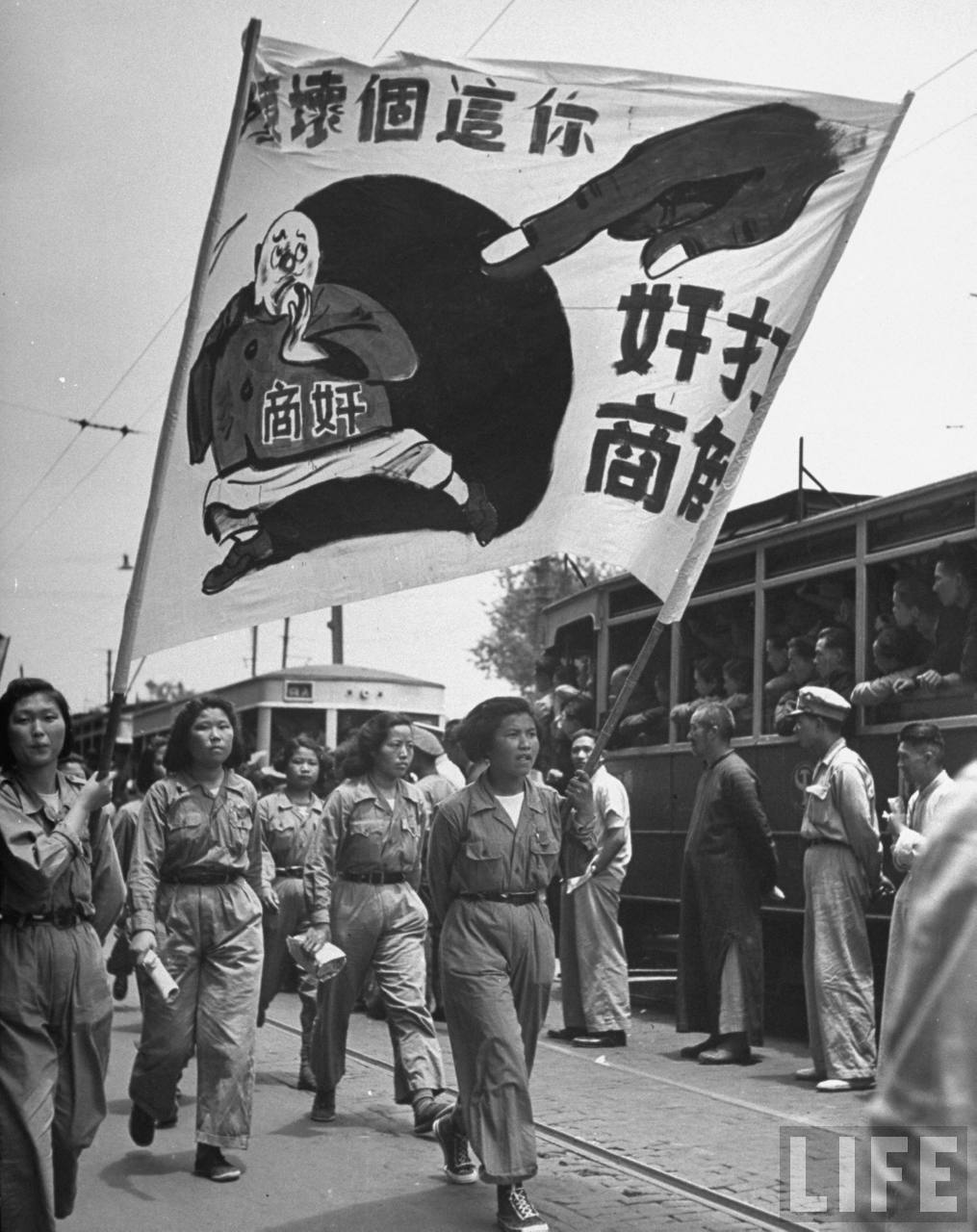 1947年,上海。军校女生们高呼口号,标语上写着“打倒奸商,你这个坏蛋”。.jpg