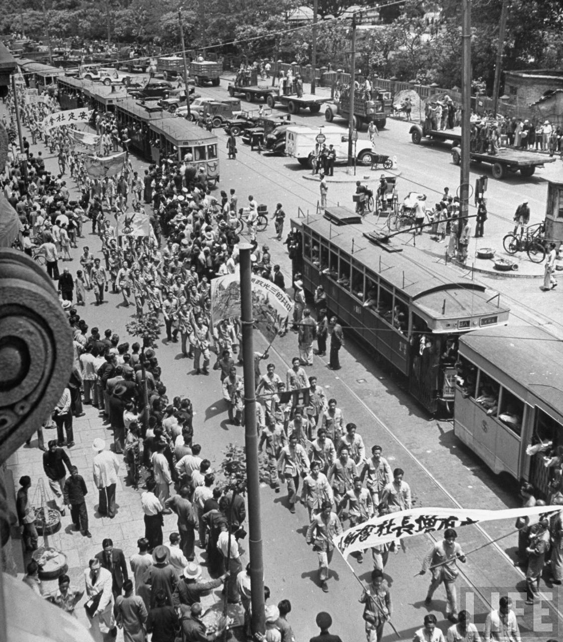 1947年,上海。学生们游行反对共产主义者抢占满洲,市民在有轨电车上围观。.jpg