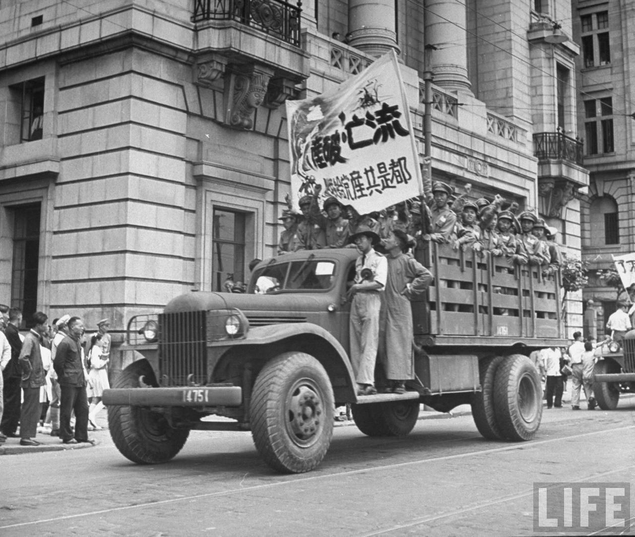 1947年,上海。学生们站在卡车上游行反对共产主义者抢占满洲,市民在围观。.jpg
