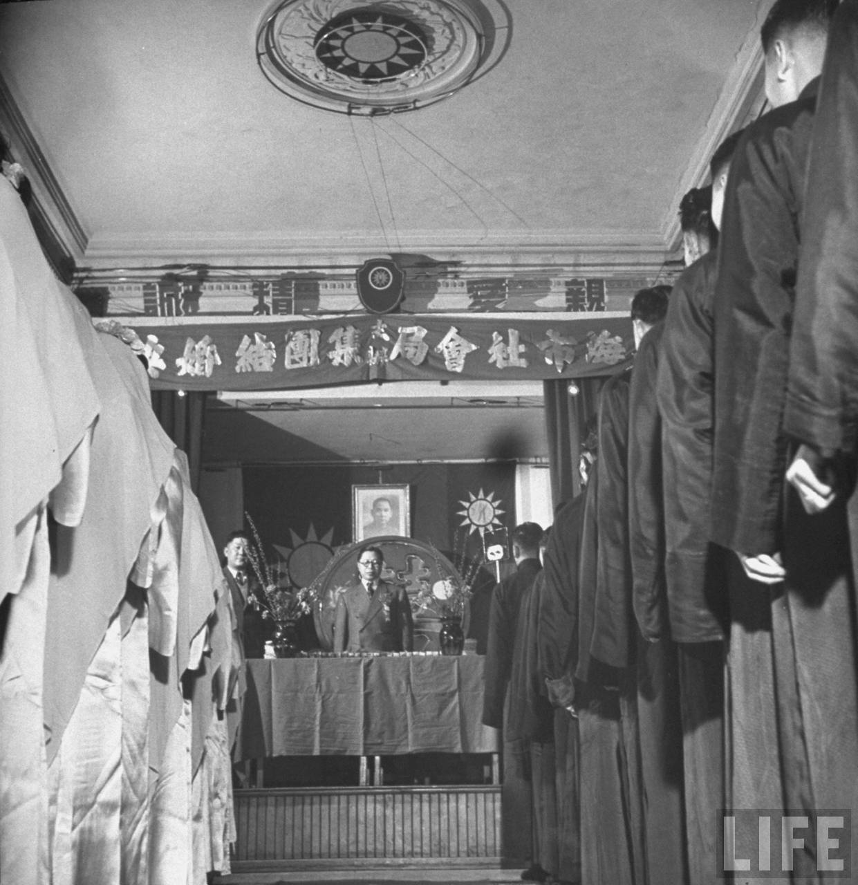 1947年,上海。市长吴国桢主持集体婚礼,标语是“上海市社会局集团结婚典礼”,口号是“亲爱,精诚”,中央有中华民国国徽。右边的新郎们穿着长袍马褂,左边的新娘们穿着旗袍,戴着盖头。.jpg