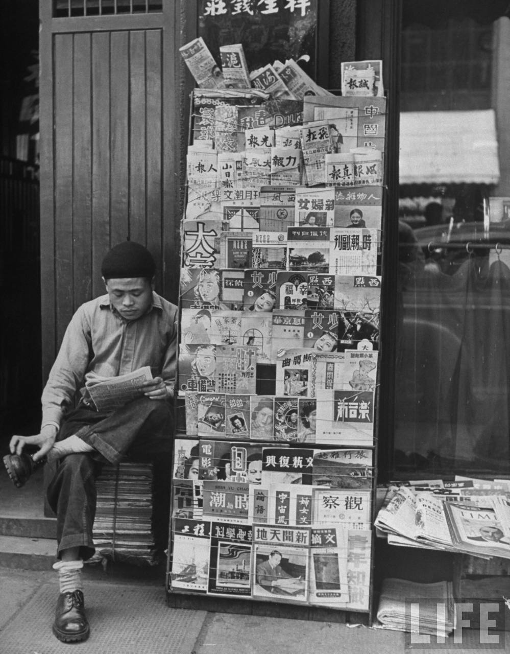 1947年,上海。认真读报的书报摊小贩,他穿着牛仔裤和新式皮鞋。他的书报摊上摆满了从美国的TIME到中华民国国内自由出版的各类书报。.jpg