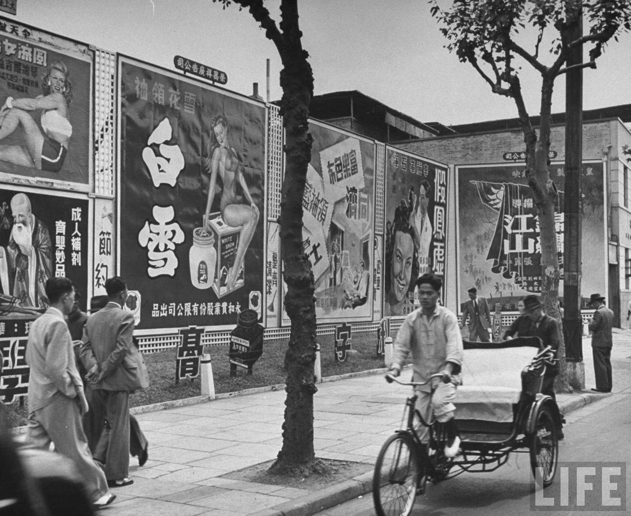 1947年,上海。骑着新式脚踏三轮车的车夫经过一面广告墙,是荣昌祥广告有限公司设立的,有各种电影、化妆品、药品的手绘美术广告画。.jpg