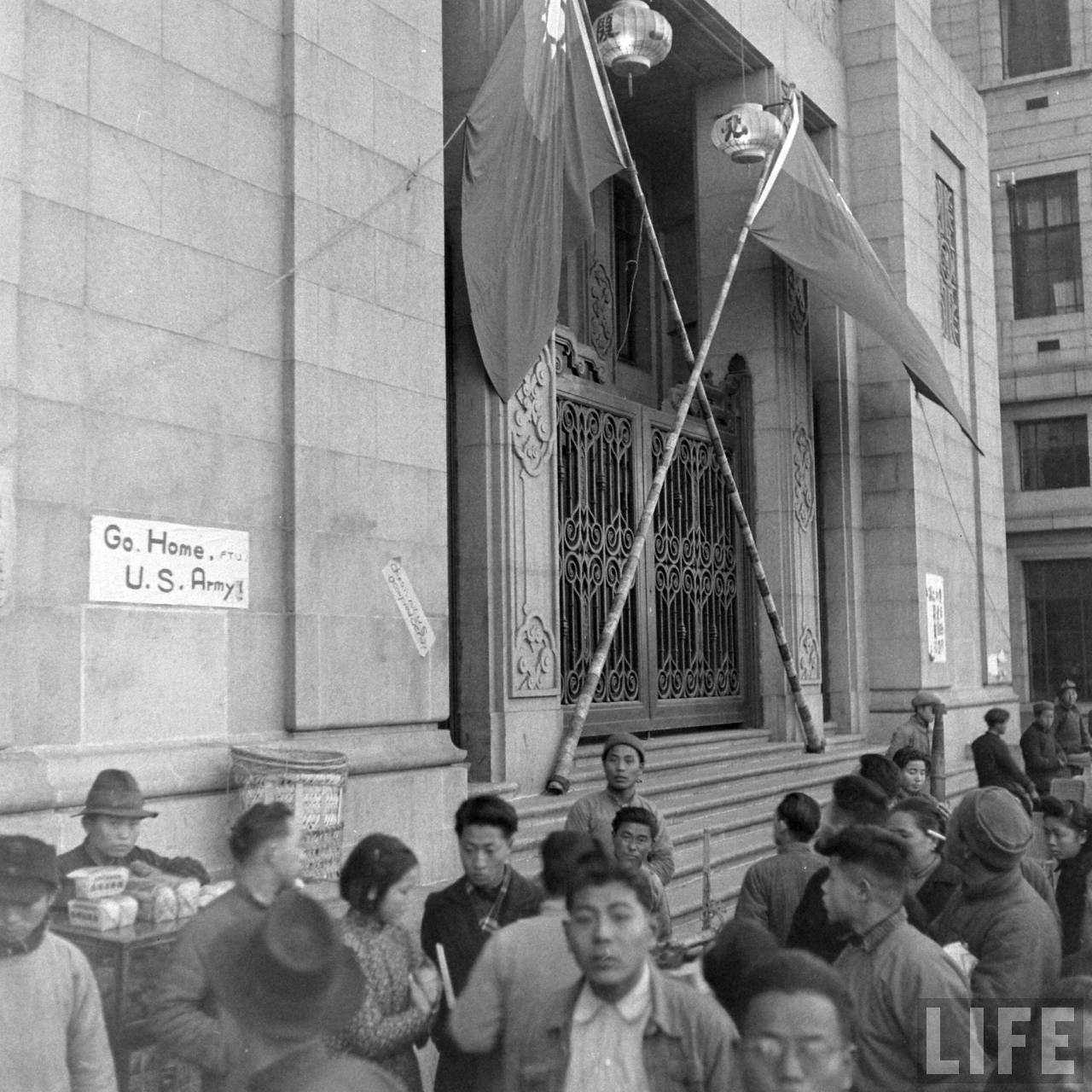 1947年,中国。这是中国银行总部办公楼前,有行人,有摆摊的,麻烦地是可以随意张贴英文反动标语go home,U.S. army(美国佬的军队,滚蛋!)。.jpg
