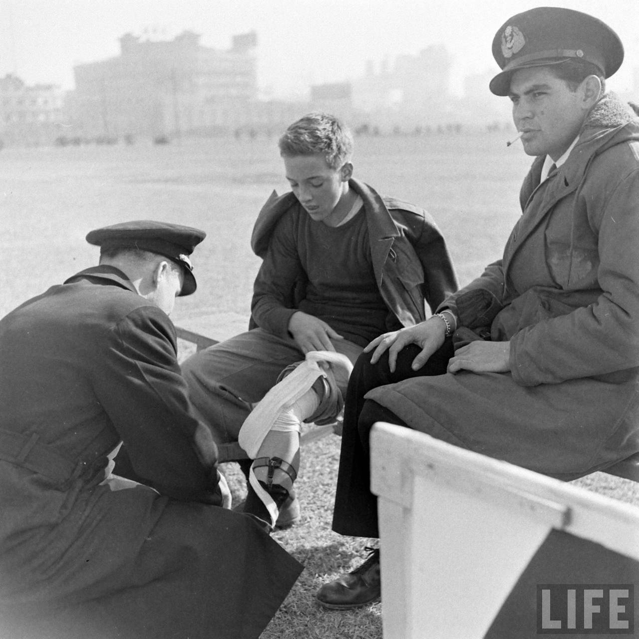 1947年,中国。这是驻华美军举行的一场美式足球友谊赛场地边上,有队员受伤了,正在包扎。.jpg