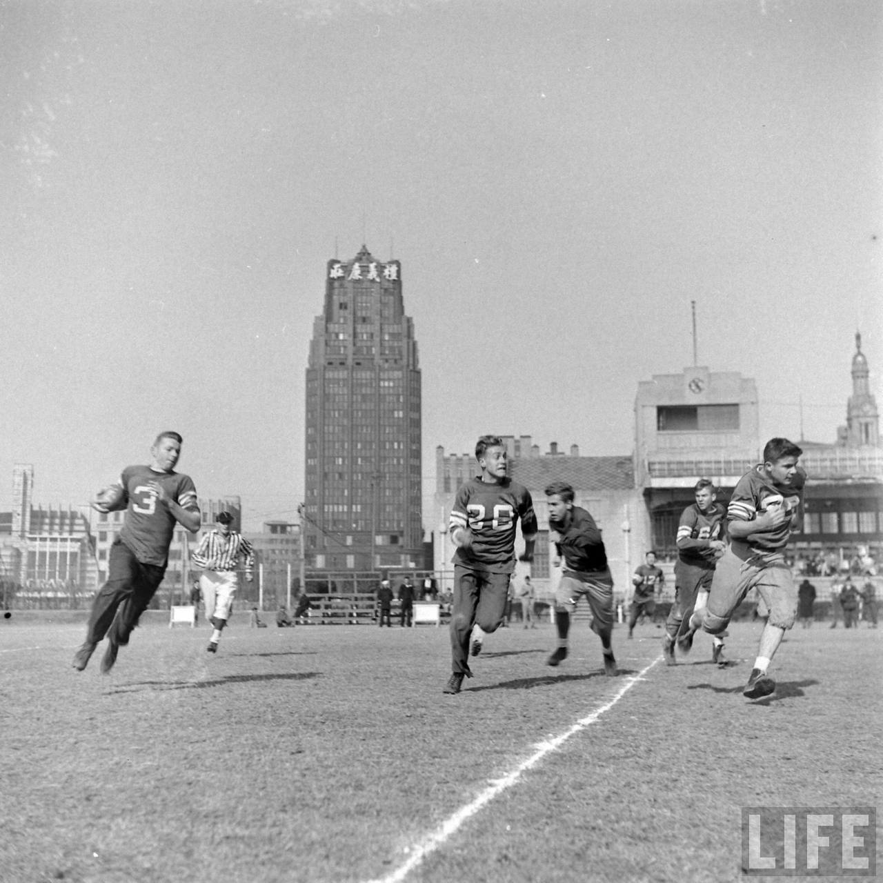 1947年,中国上海。这是驻华美军举行的一场美式足球友谊赛,队员在比赛,美军军官们在观看。具体城市是青岛或上海,这个图的背景这栋大楼上面有“礼义廉耻”四个大字。那幢高楼是当时远东第一高楼86米24层的国际饭店。.jpg