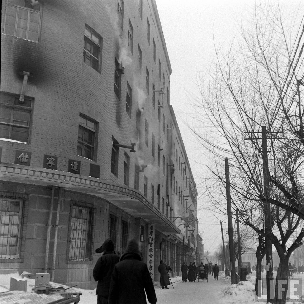 1947年,沈阳。严冬,枯树,电线杆,狗皮帽,暖气熏着的楼房,背景是辽宁省储蓄总会南市分会。.jpg