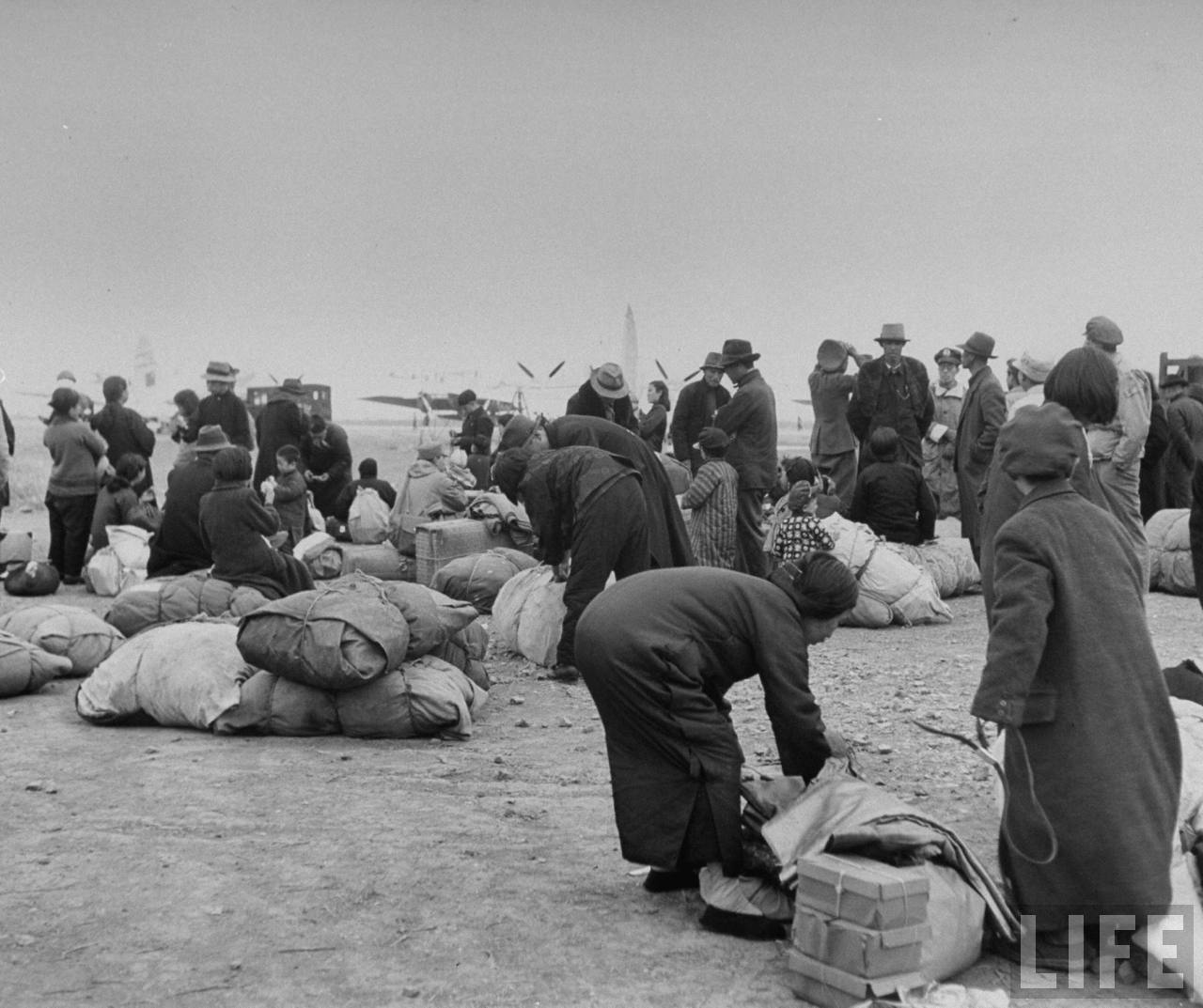 1947年,沈阳。战争阴云笼罩,市民们在机场准备逃到南方城市,前面的彩色照片也是这个情形,从1946年登上LIFE摄影师汽车的北满的尼姑图像开始,这类图像比比皆是,直到数百万之众逃亡到台澎金马。.jpg