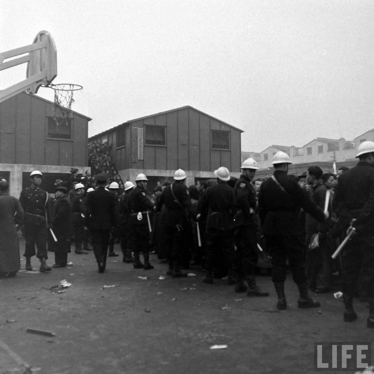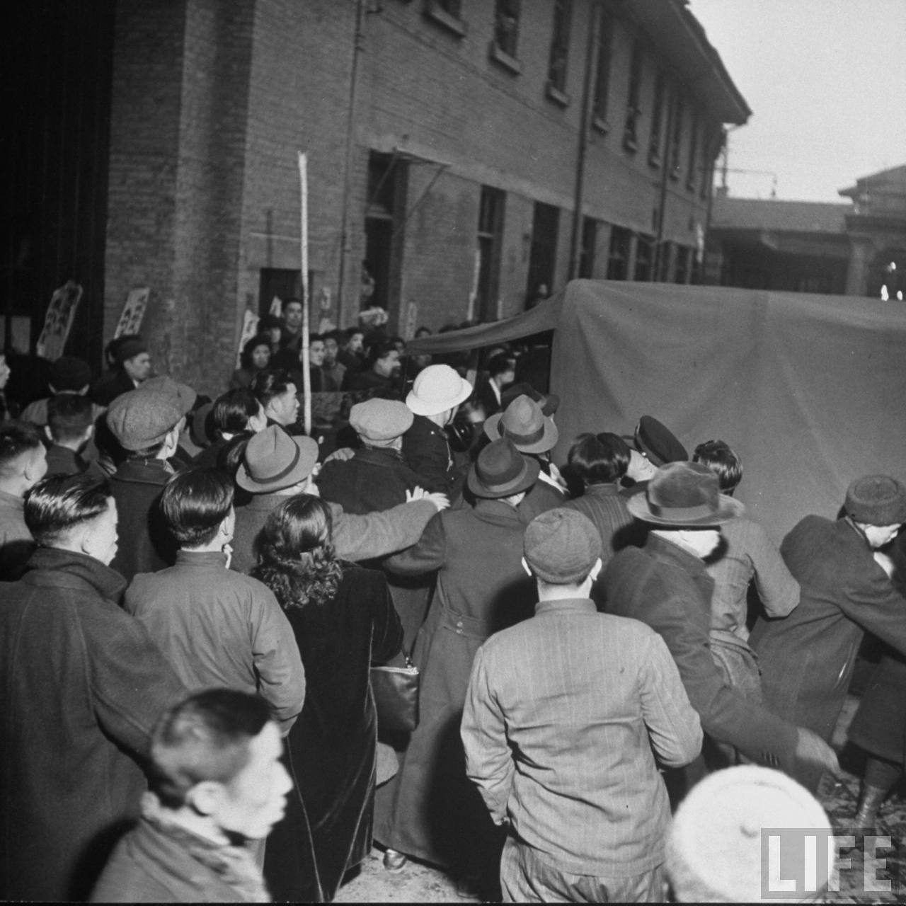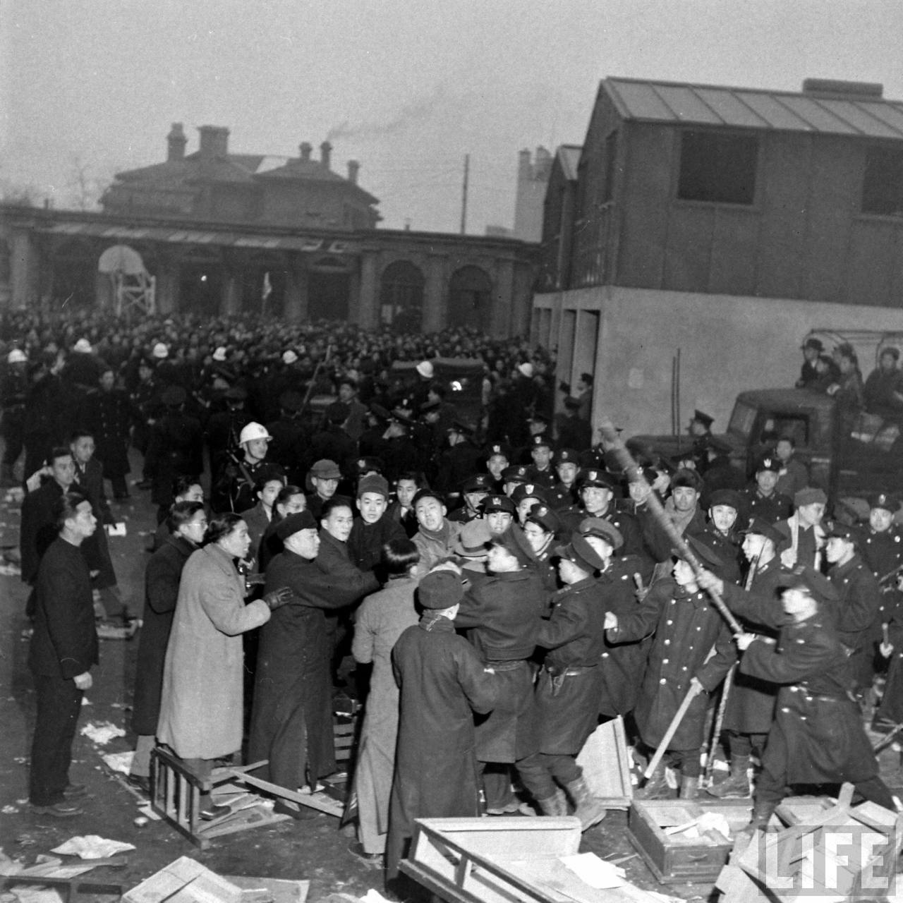 1948年1月31日,上海。警方见威胁无效,便发动攻击,舞女们毫不畏惧,以柴棍,旗帜等作为武器,几人围攻一人,平日弱不禁风的女子,到了被逼急的时候,全成了凶悍的母老虎,她们边打边骂,不少警察被打翻在地,哀呼小姐饶命。.jpg