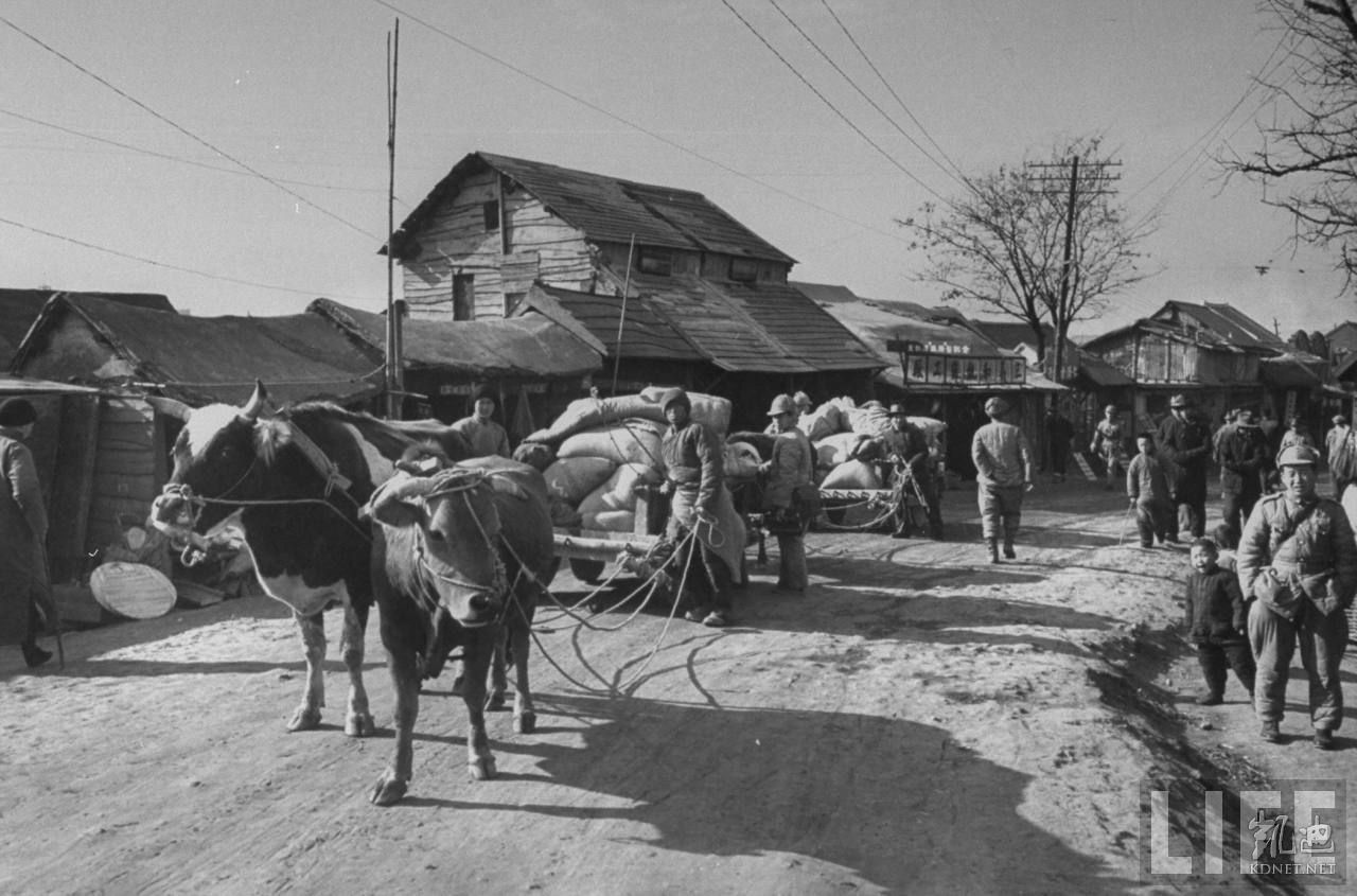 1948年12月,蚌埠。一个小村的乡绅用马车赶着自己的行李和粮食准备南下逃亡。.jpg