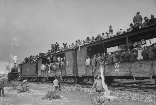 1948年12月,蚌埠。从中国北方蜂拥而入的难民坐在火车顶棚上,这是在Chang Pa Ling(?)火车站。.jpg