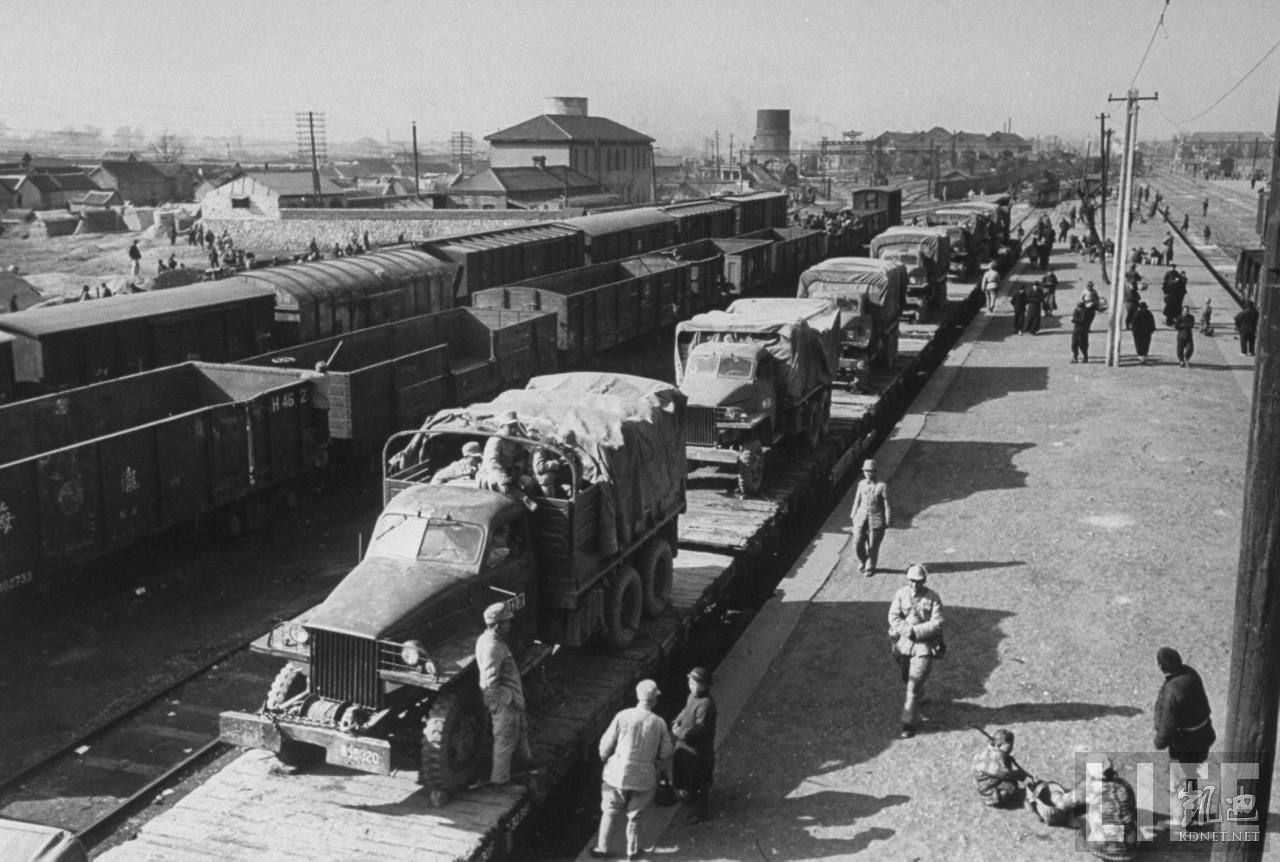1948年12月,蚌埠。国军卡车运输军事物资和援军抵达蚌埠火车站。.jpg