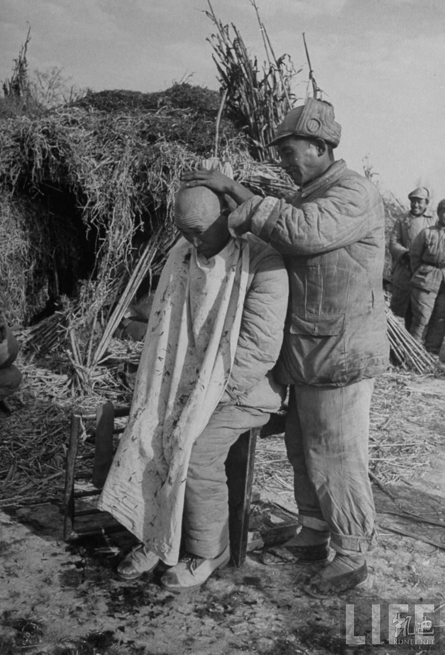 1948年12月,蚌埠。国军士兵在前线微笑着剃光头,这是他们统帅蒋介石的头式。.jpg