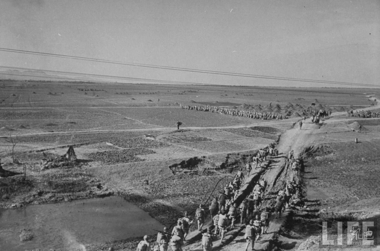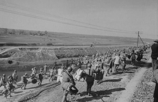 1948年12月,蚌埠。国军士兵肩挑背扛向淮河北岸移动,以解救被百万共产党军围困的国军。.jpg