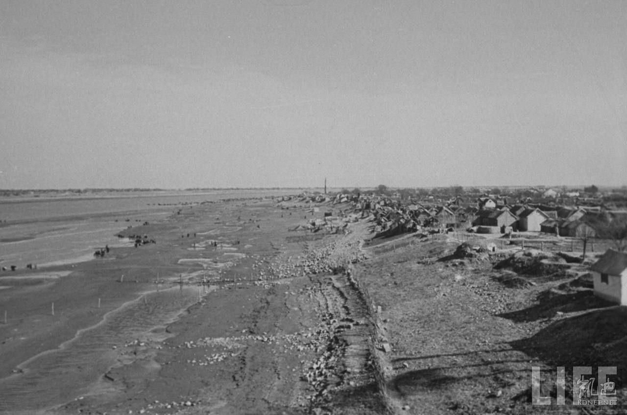 1948年12月,蚌埠。曹老集全景图,为防共产党军队抢滩登陆战,淮河岸边的集镇周围全部用木桩链接的铁丝网。.jpg